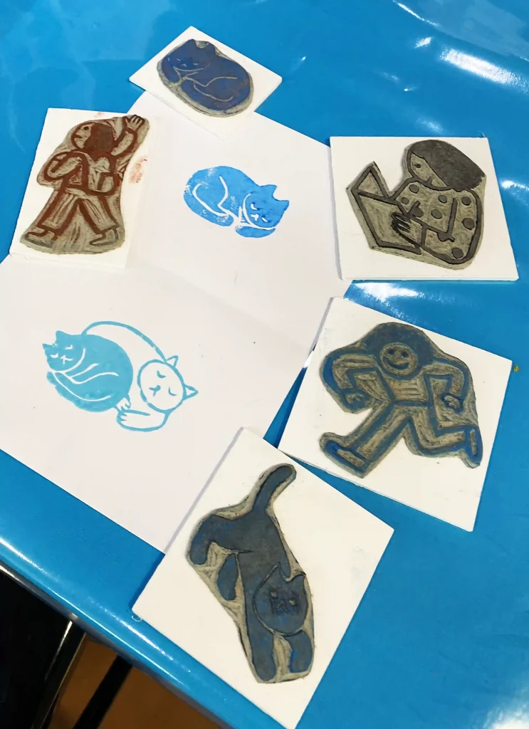 - Réalisation de la couverture sur les 2 pages extérieures, à l’aide de tampons linogravés ou en dessin libre.