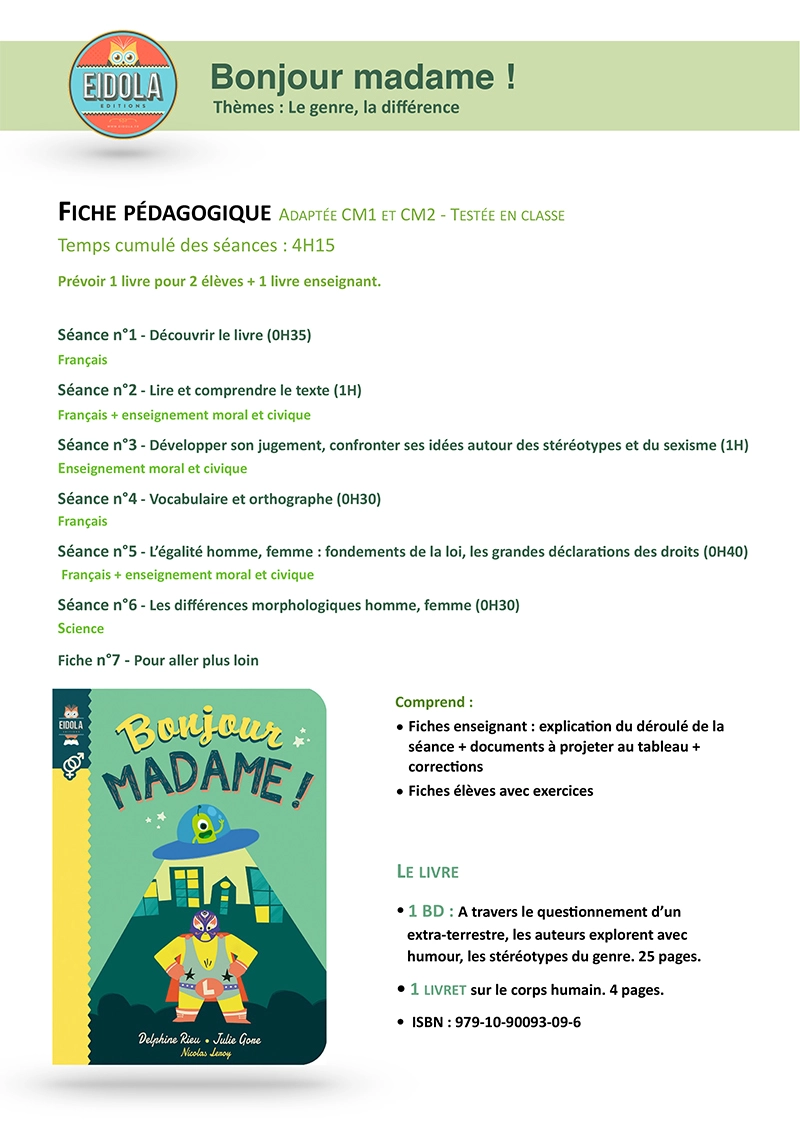Adaptée aux classes de CM1 et de CM2, nous vous proposons des activités pédagogiques permettant d’appréhender et de débattre avec les élèves du genre, tel qu’il apparait dans la société, la langue française, les grands textes de loi, la morphologie humaine, et de mettre en avant la tolérance des différences sous toutes ses formes.