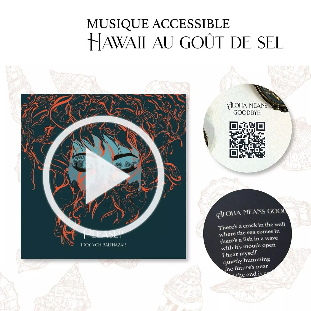Accessibles via des QR codes, la musique, les ambiances sonores et les voix de Julie et Troy nous entrainent au milieu du Pacifique, entre le sable blanc, les orchidées, les oiseaux de paradis et les ohia lahua aux fleurs rouges pour être témoins de l’amour de cet homme et de la femme requin.