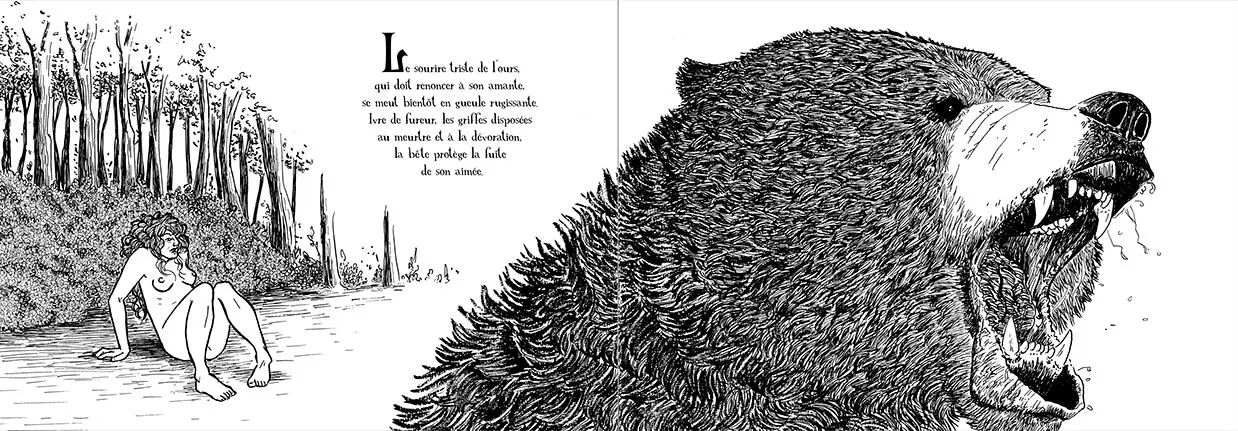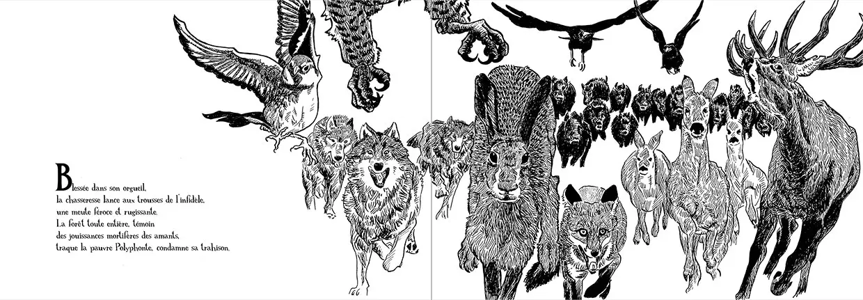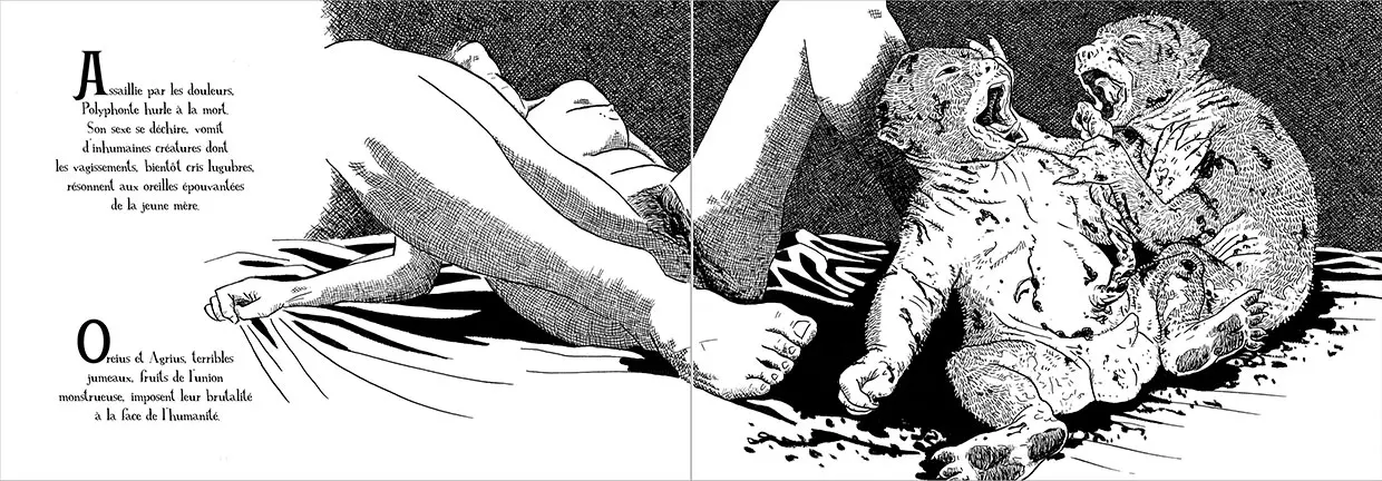 Ce livre pour adultes reprend le mythe de Polyphonte dans une tonalité plus moderne où la sexualité et les châtiments sont exploités avec beauté, poésie, violence et crudité. Les magnifiques noirs et blancs de Cécile Vallade, sans concession, en restituent toute la puissance.